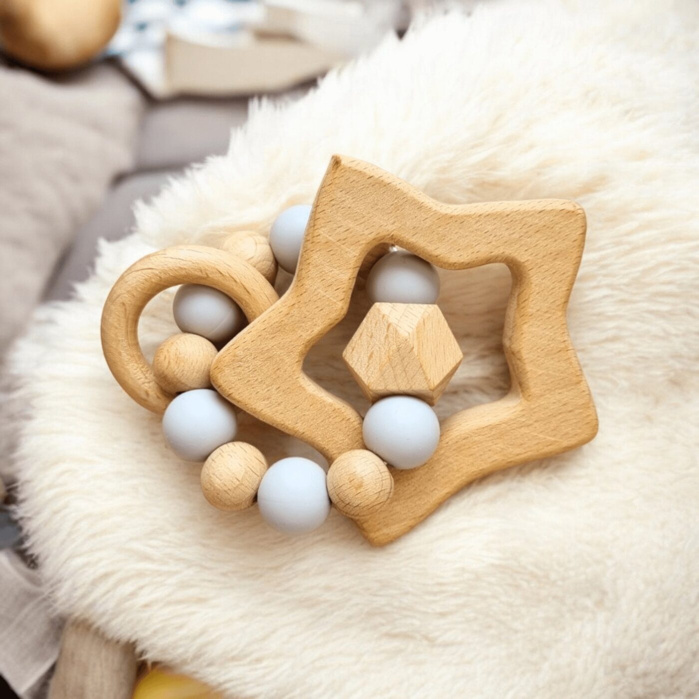 Anneau de dentition biface : silicone alimentaire d’un côté, bois naturel de l’autre. Bébé choisit instinctivement le côté qui soulage. Sans BPA, sans phtalates. Dès 3 mois.