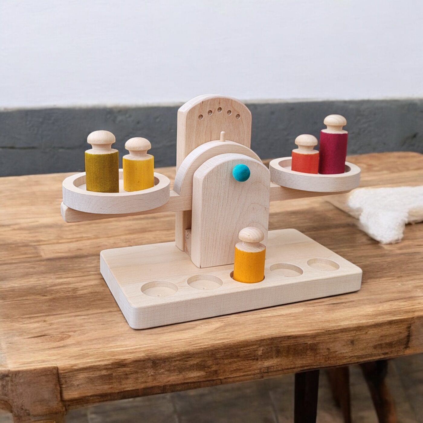 Balance en bois naturel avec cylindres de tailles différentes. L’enfant soupèse, compare, ajuste : il comprend le poids avec ses mains, pas avec des mots. Et dans quelques années, c’est le comptoir d’une épicerie imaginaire. Dès 3 ans.