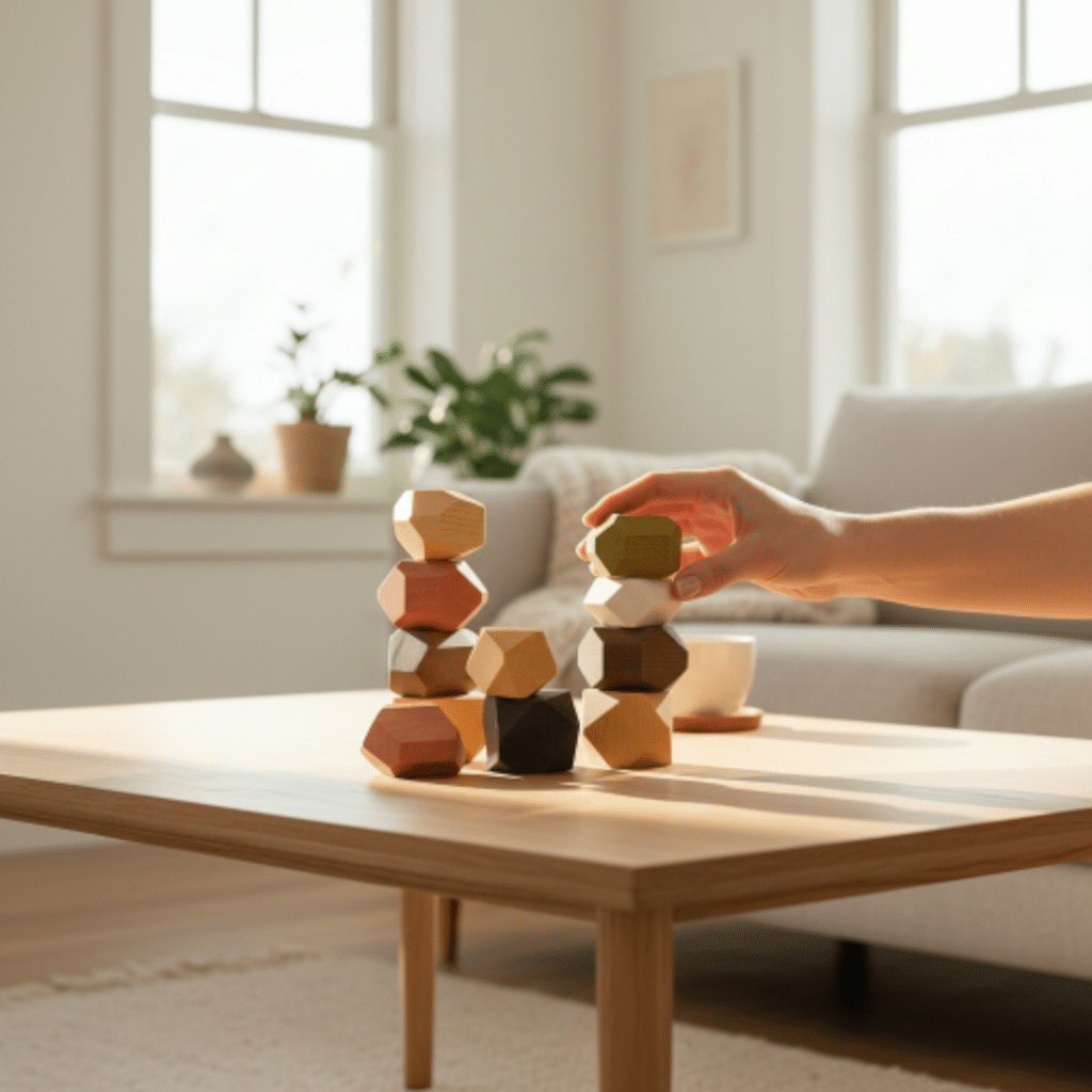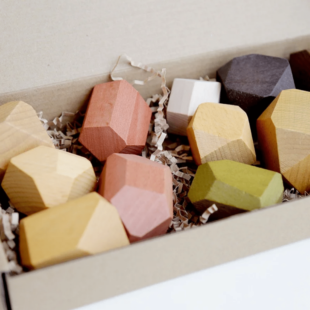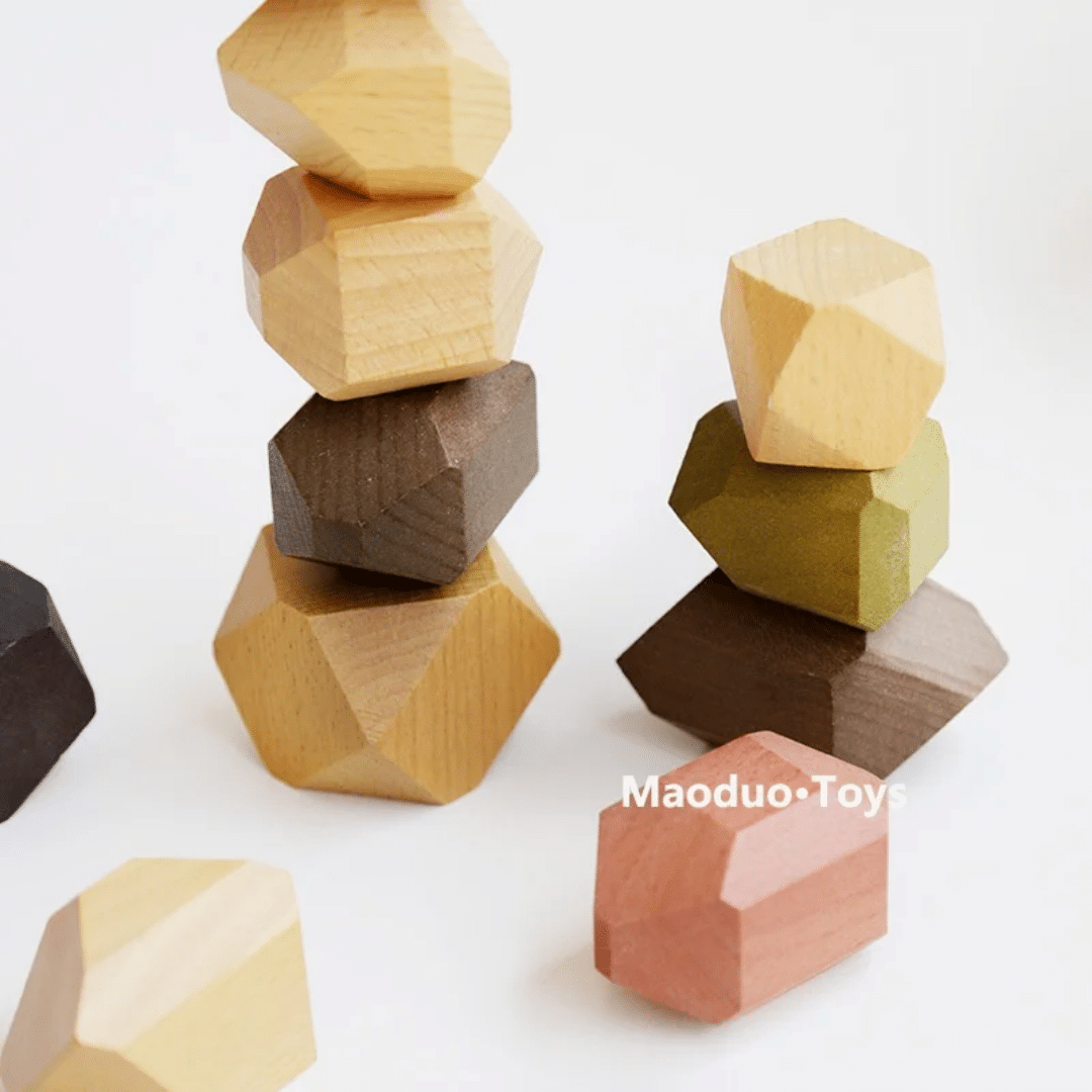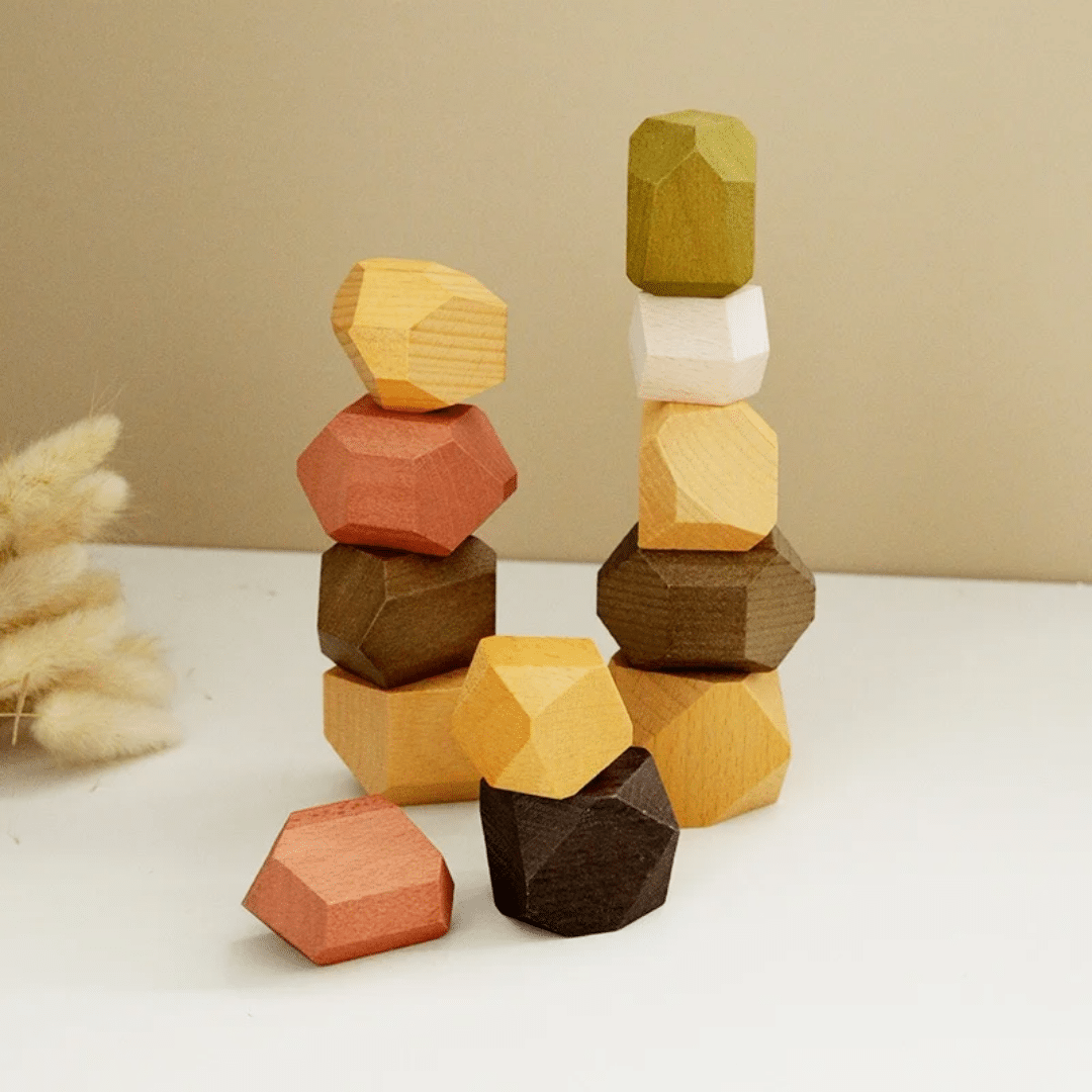 Chaque pierre a une forme irrégulière, un poids différent, un centre de gravité unique. Le défi : les empiler sans que tout s'écroule. C'est un jeu de patience, de concentration et de physique intuitive. Les enfants passent des heures à trouver le point d'équilibre parfait. Et les adultes aussi, soyons honnêtes : c'est le jouet qu'on "teste" le soir après le coucher de l'enfant.