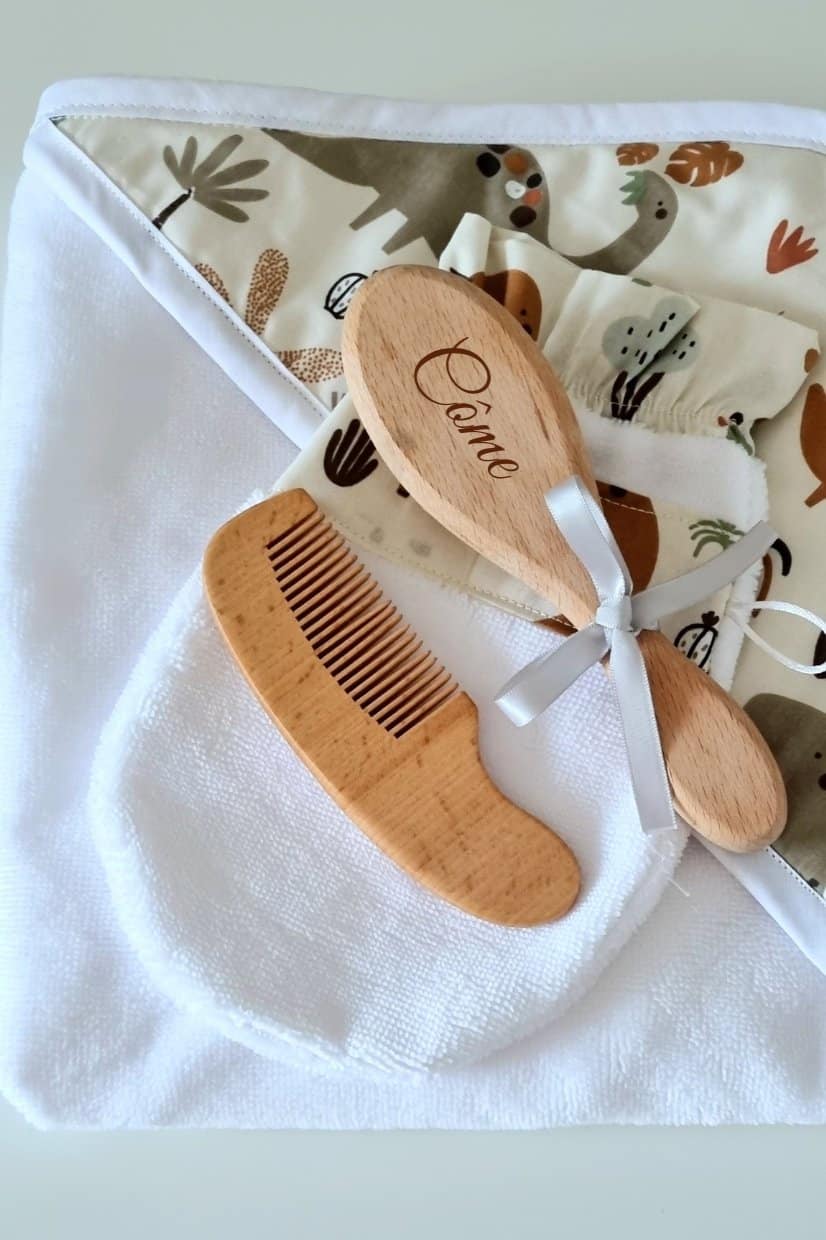 Cape de bain en bambou bio, motif dinosaure avec crête. Bébé sort du bain et devient un petit dino. Ultra-douce, absorbante, et irrésistible pour les grands-parents.
