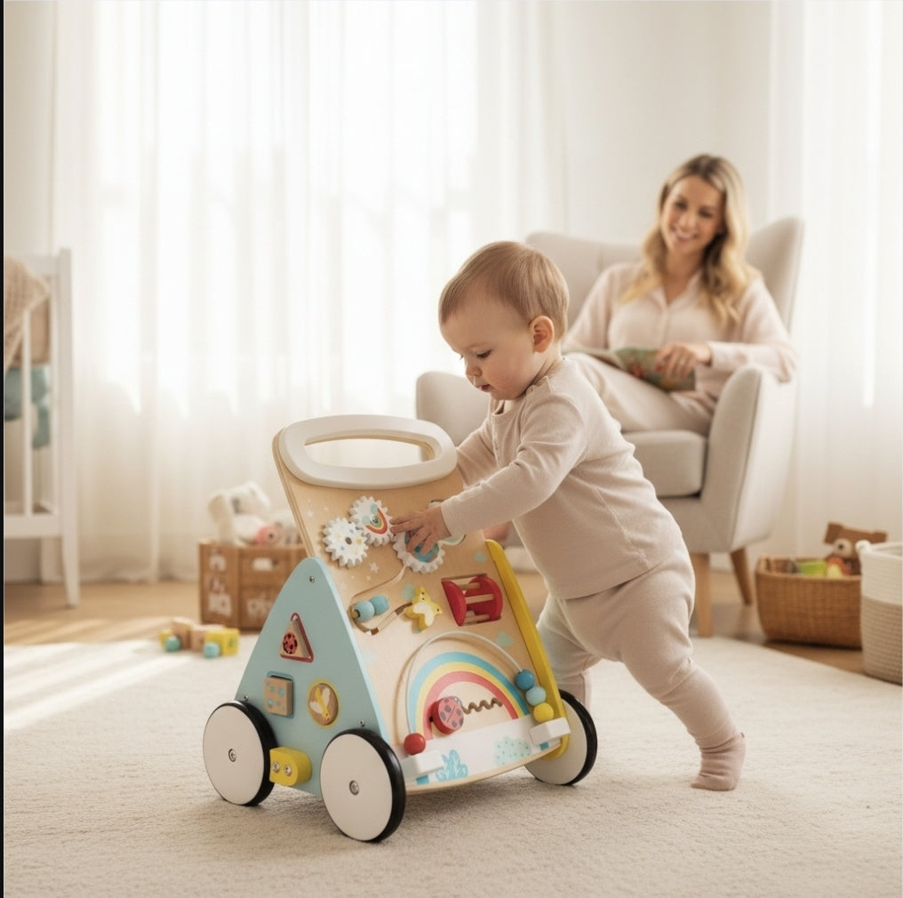 Un crocodile vert en bois qui avance quand bébé pousse. Le guidon est à la bonne hauteur, la structure est stable, et le crocodile claque de la mâchoire en roulant (parce qu'un chariot de marche sans personnalité, c'est un meuble). Bébé se hisse, pousse, et traverse la maison accompagné d'un compagnon bruyant et sympathique.
