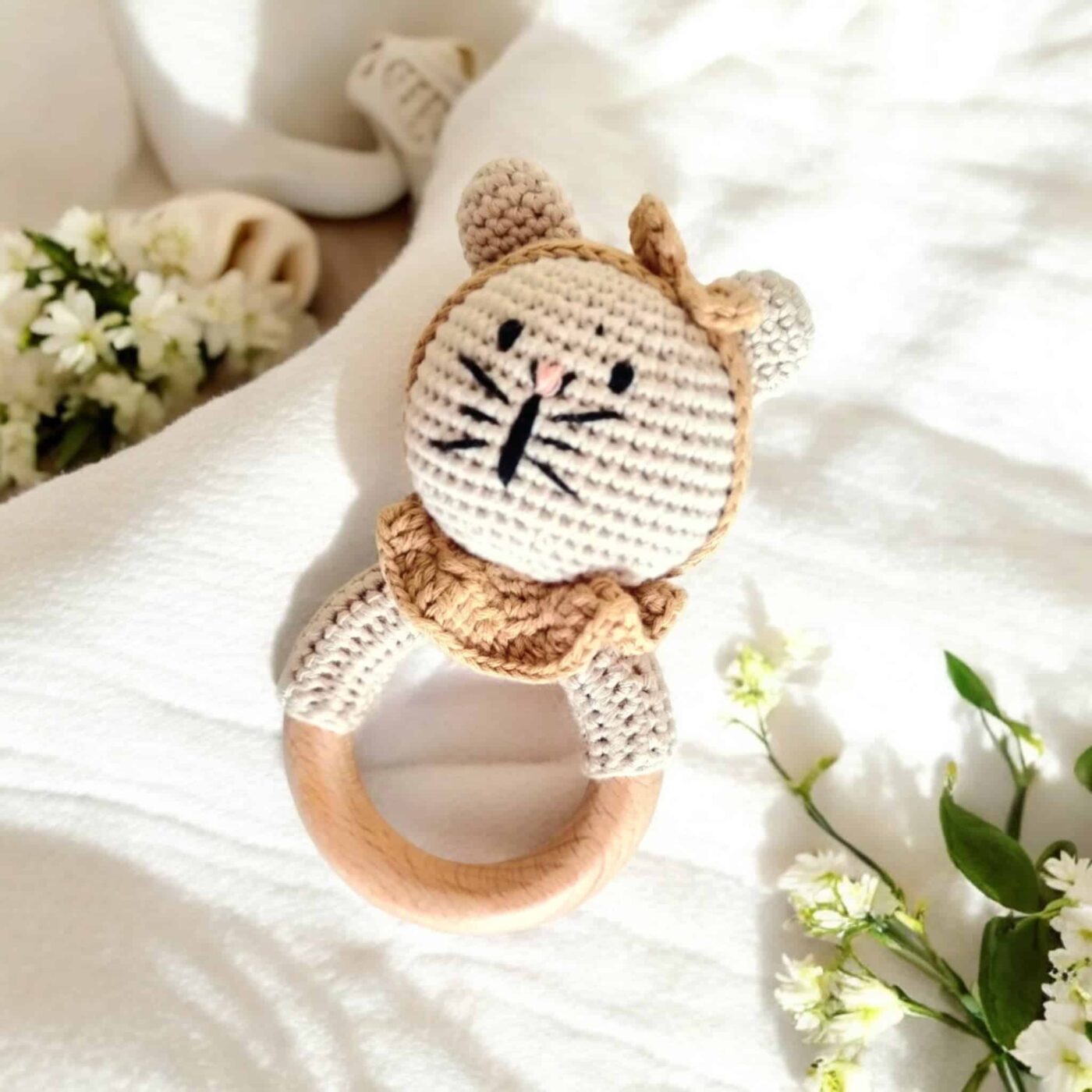 Hochet en crochet fait main : chat, chien, lapin ou hamster. Le compagnon familier de la maison, en version miniature pour les mains de bébé.