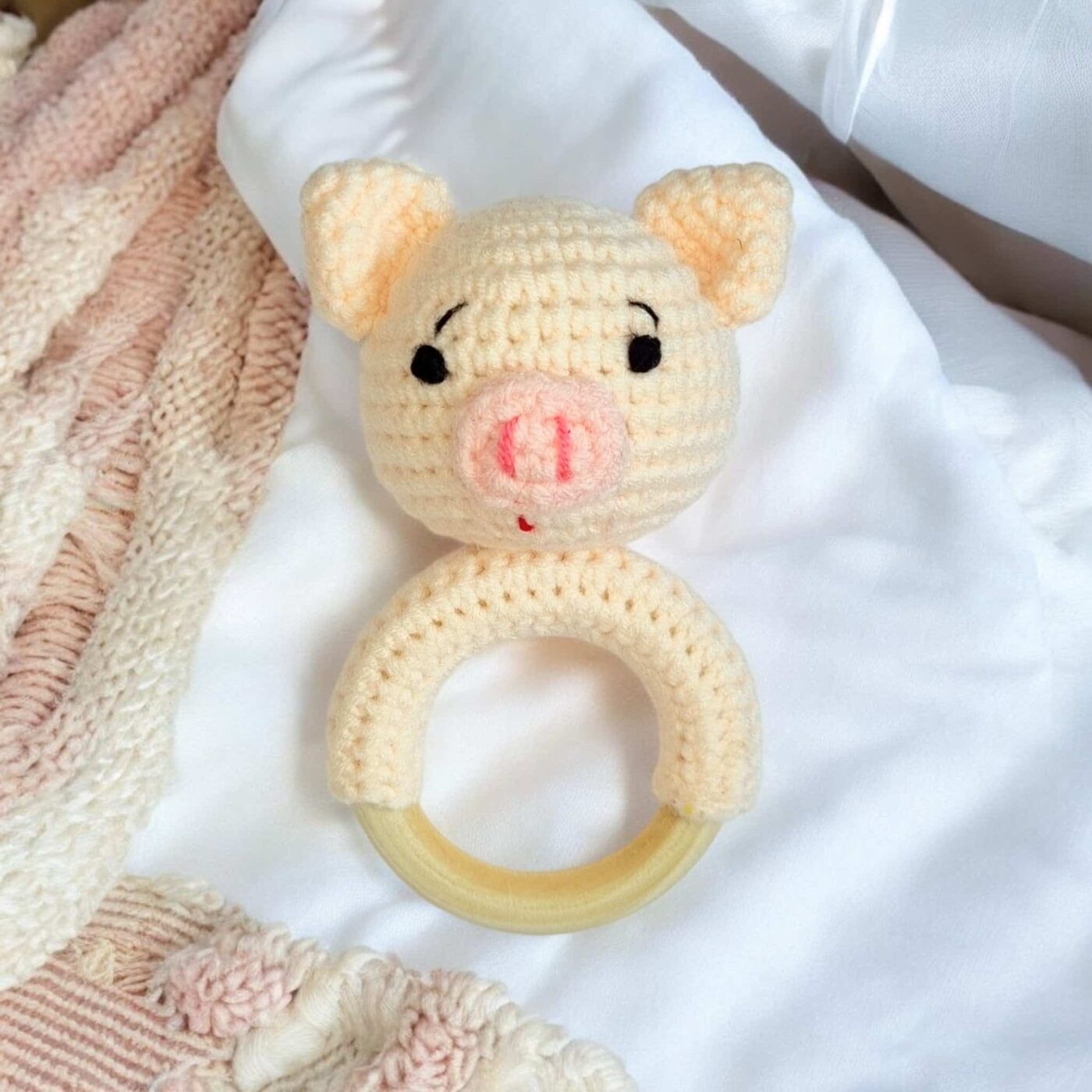 Vache, cochon, poule ou mouton : la ferme se glisse dans les mains de bébé, et chaque moment devient une histoire. Crocheté à la main, chaque hochet est une pièce unique qui ne sera jamais strictement identique à une autre. Le coton naturel a une douceur que le plastique ne peut pas imiter, et l'anneau bois facilite la prise en main des tout-petits.