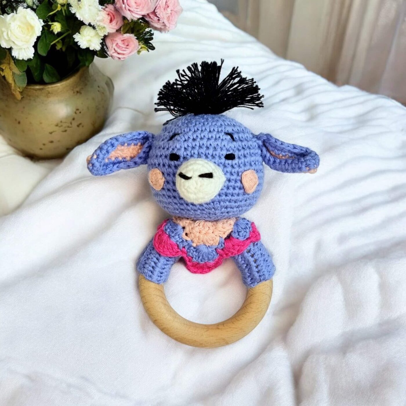 Hochet en crochet fait main : vache, cochon, poule ou mouton. Coton naturel, anneau bois, grelot. Chaque pièce est unique parce que chaque main qui la crochète l’est aussi.