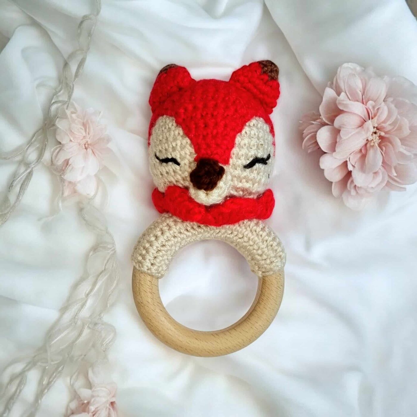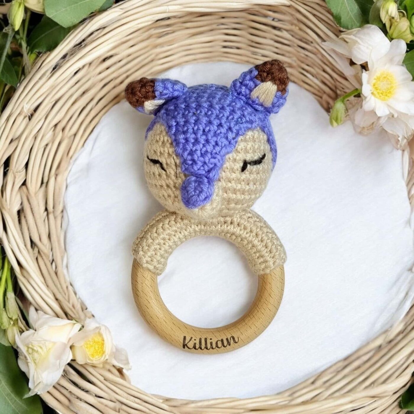 Hochet en crochet fait main : renard, cerf, hérisson ou hibou. Coton naturel, anneau bois, grelot doux. Le premier animal qu’il reconnaîtra dans les livres.
