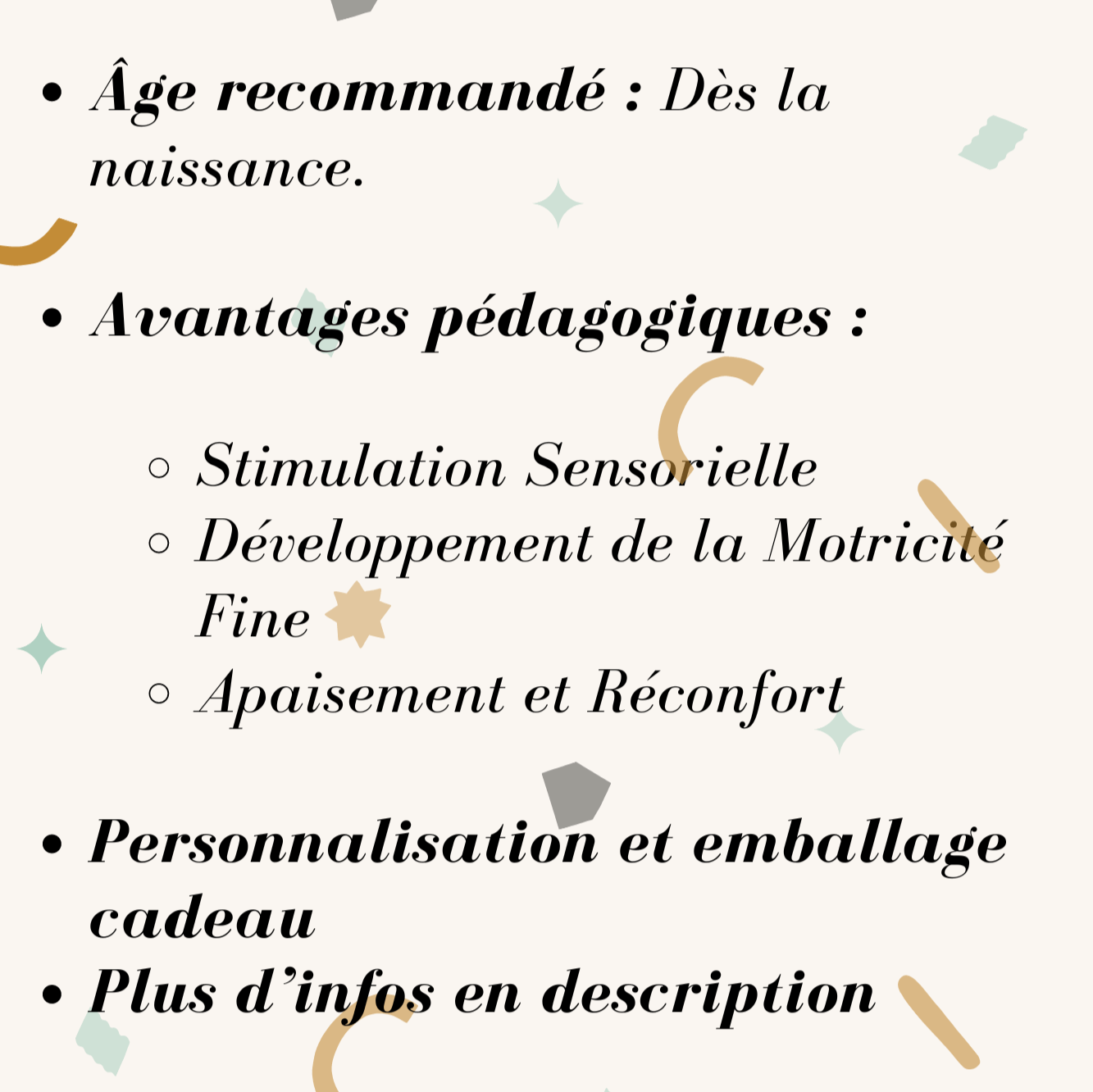 Le toucher du coton travaillé, le son du grelot doux, la forme reconnaissable de l'animal : tout stimule sans fatigue. Pas de couleurs éclatantes, pas de sons de jouet en plastique. Juste la matière naturelle et la simplicité. C'est un objet pensé pour les premières semaines, quand tout est encore nouveau.