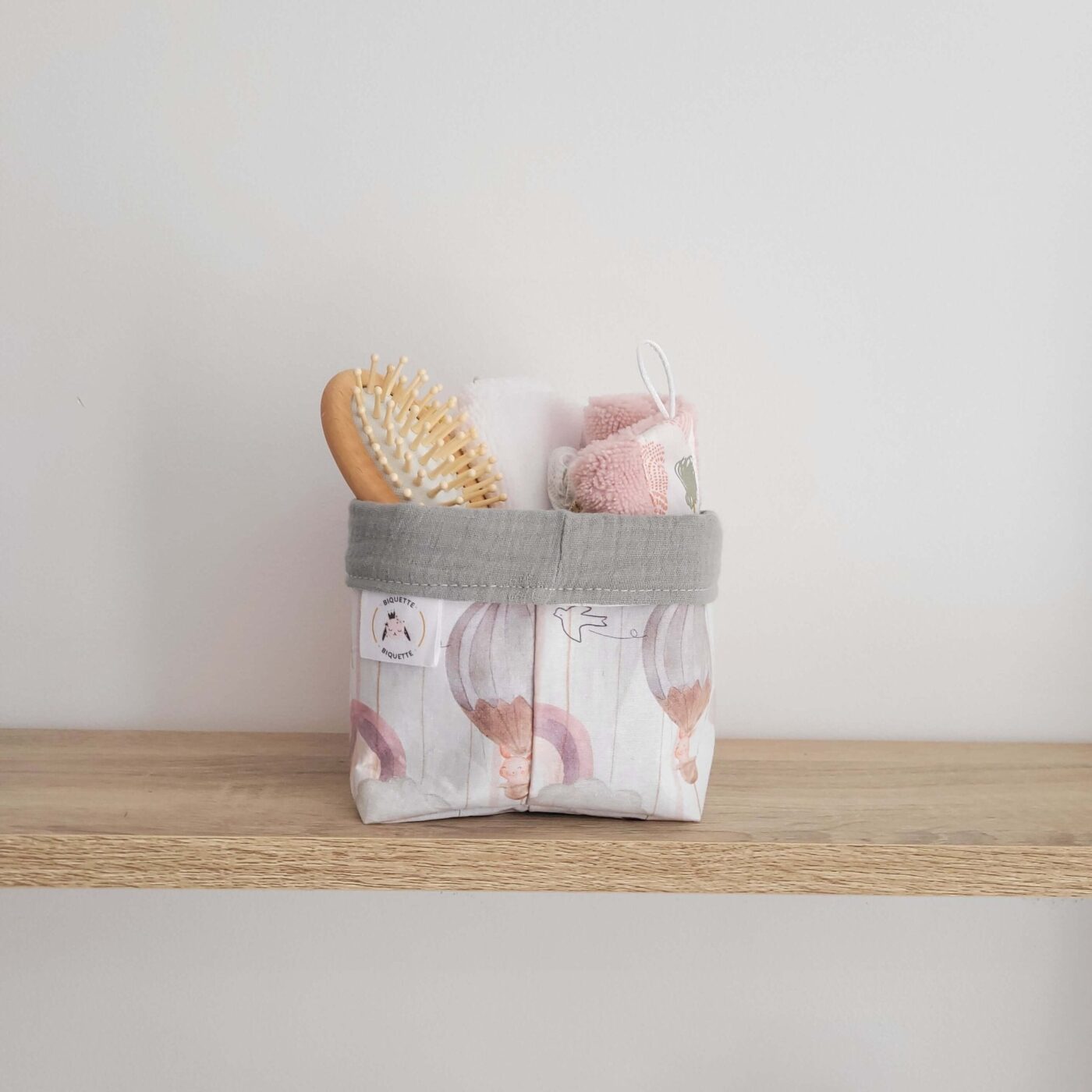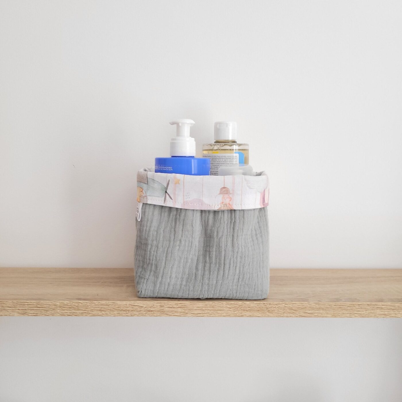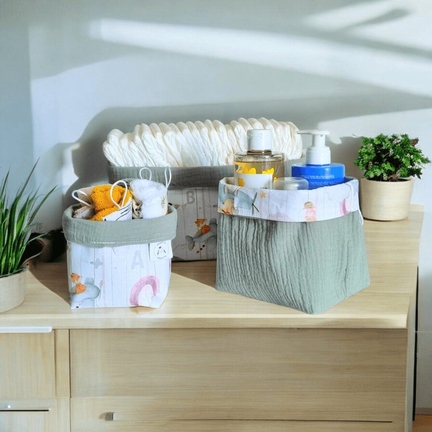 Imperméabilité complète, deux tailles optimisées, tissu durable, design cohérent. Pas de plastique qui pelote, pas de panier qui se déforme. C'est du rangement qui dure, qui reste joli, et qui servira encore quand les couches seront un lointain souvenir.
