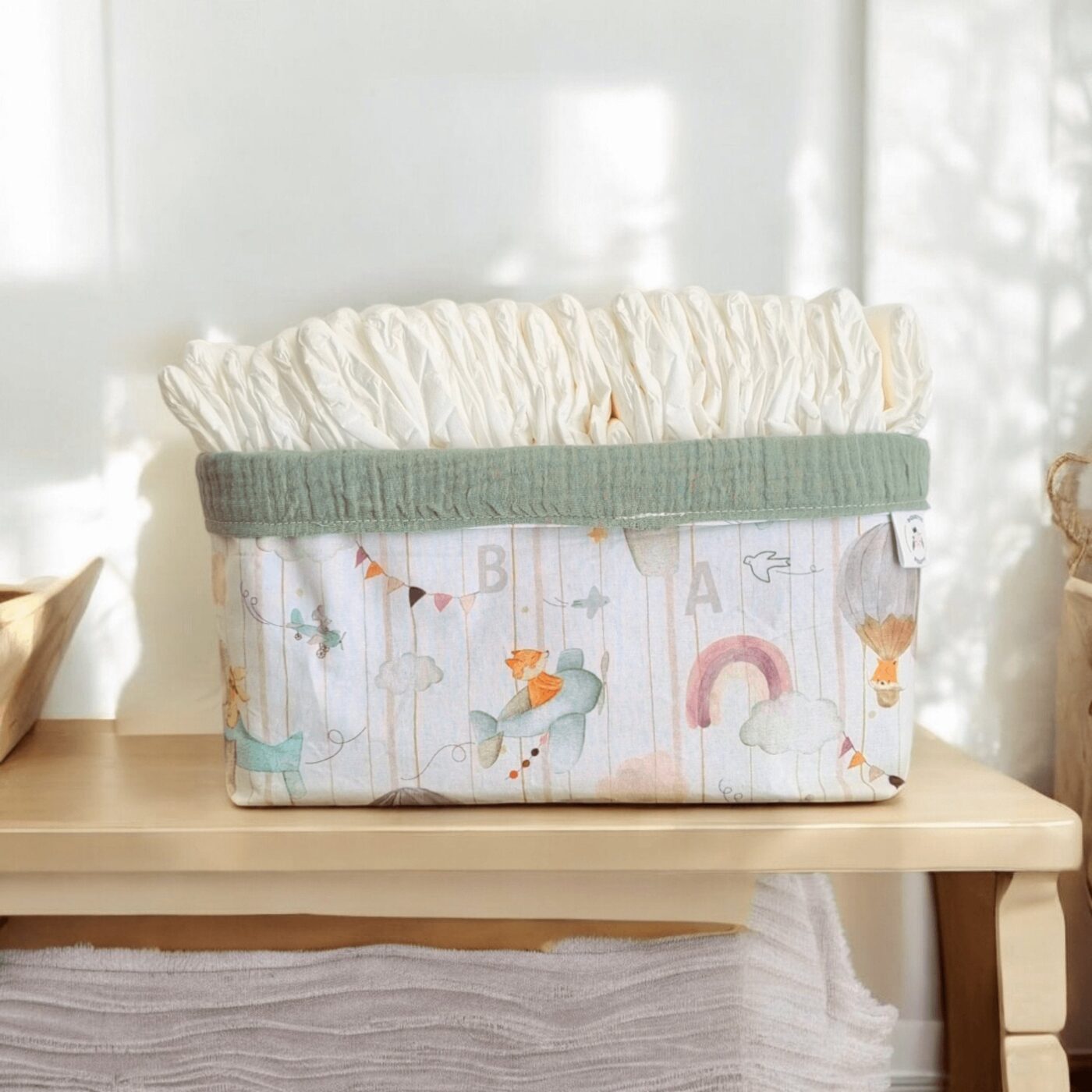 Lot de 2 paniers à couches imperméables motif avions. Pratique, joyeux, durable. Le rangement qui vous embarque ailleurs, même à 2h du matin.
