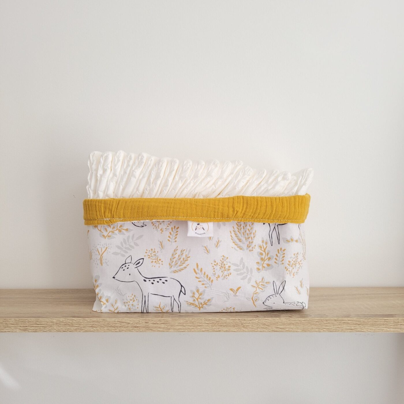 Lot de 2 paniers à couches imperméables motif biches. Élégant et pratique. Le rangement qui prouve qu’on peut avoir du goût même à la table à langer.