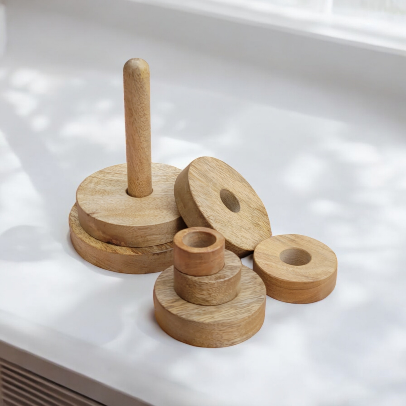 À 6 mois, bébé retire les anneaux. À 12 mois, il les replace. À 2 ans, il construit seul dans le bon ordre. À 3 ans, il peut fermer les yeux et les différencier au toucher. Quatre phases de jeu sur le même objet, c'est rare.