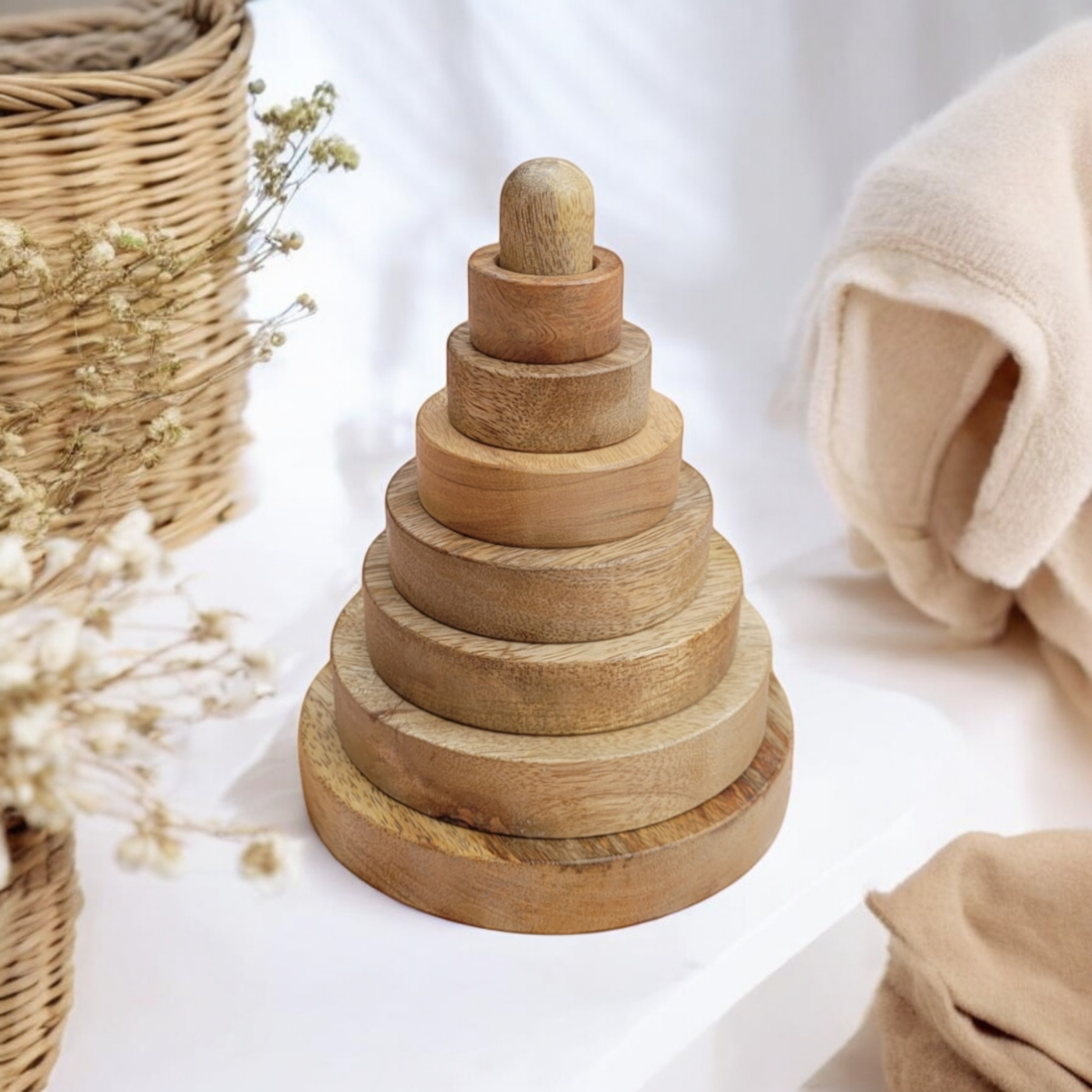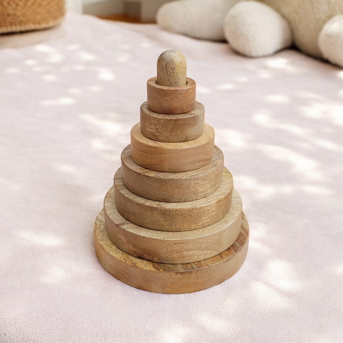 La tour à empiler est l'un des jouets d'éveil les plus documentés de la pédagogie Montessori. Celle-ci est en bois naturel, sans peinture : le grain du bois et ses variations naturelles de teinte sont la seule décoration. Sept anneaux de tailles progressives, une sphère au sommet. Dès 6 mois, bébé commence par retirer les anneaux un par un (le geste de prendre et de lâcher est déjà un apprentissage). Vers 12 mois, il commence à les remettre. Vers 18 mois, il comprend la logique de séquence du plus grand au plus petit et la reproduit seul.