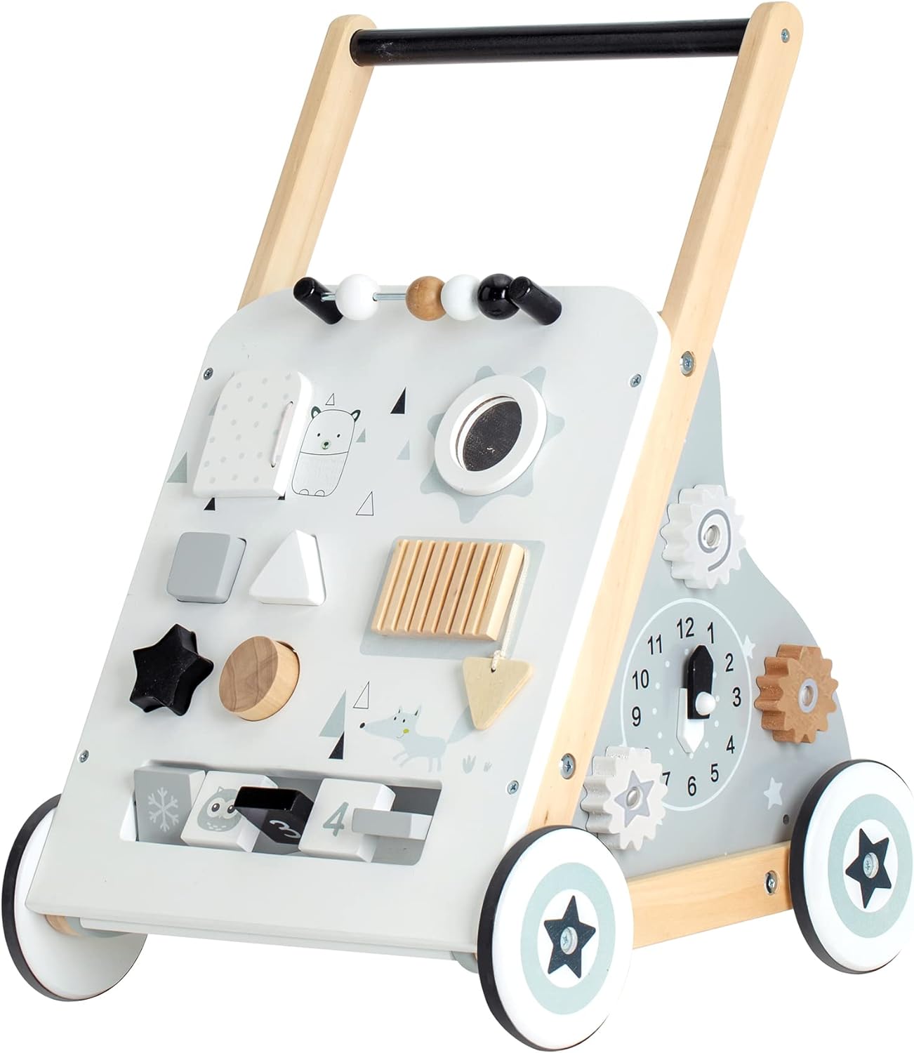 Ce trotteur n'apprend pas à bébé à marcher. Bébé apprend tout seul. Le trotteur lui donne juste un appui stable à pousser, un guidon à saisir, et des activités à explorer en chemin. D'un côté, c'est un chariot de marche solide. De l'autre, un centre d'activités avec formes à encastrer, engrenages, et éléments à manipuler. Bébé pousse, s'arrête, joue, repart.