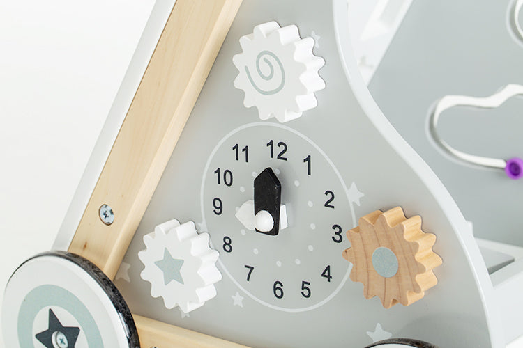 Face marche : un guidon solide, une structure stable, une résistance adaptée. Face activités : des formes à manipuler, des engrenages à tourner, des défis à résoudre. Quand bébé ne marche pas encore, il joue assis devant le panneau d'activités. Quand il se lève, le même objet l'accompagne debout.