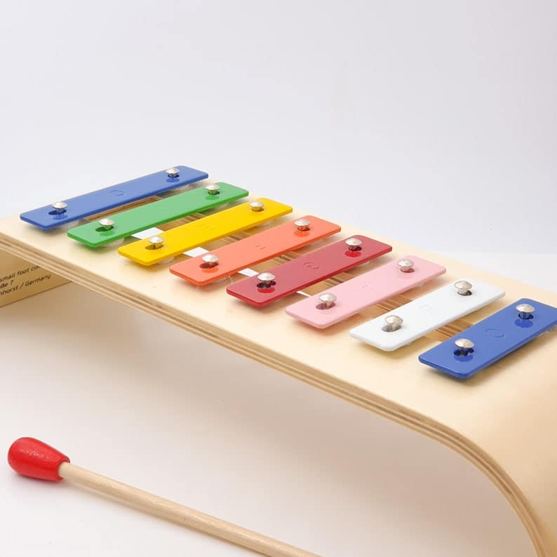 Huit lames de métal, huit couleurs, huit notes justes. Le maillet en bois frappe, et le son est clair, rond, agréable. Pas un bruit métallique qui agresse. C'est la différence entre un jouet qui fait du bruit et un instrument qui fait de la musique. Ce xylophone ne prétend pas être un jouet. C'est un premier instrument.