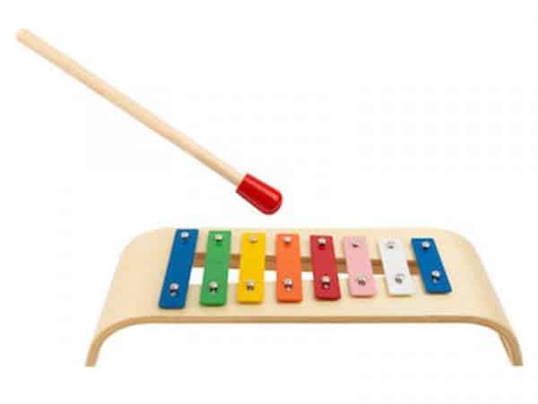 Les lames sont colorées pour aider l'enfant à retrouver ses repères. Mais ce ne sont pas des couleurs primaires criardes. C'est une palette pensée, cohérente. Et quand il ne joue pas, le xylophone est assez joli pour rester sur l'étagère. C'est un objet qu'on montre, pas un jouet qu'on cache.
